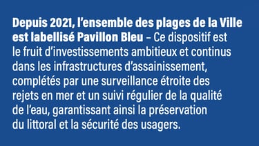 Protection et qualité des eaux de baignade : une infrastructure spécifique a été mise en place pour limiter les rejets au niveau de la Grande Plage, complétée par la programmation de bassins de rétention (Labordotte, Marbella, émissaire de la Milady) pour mieux gérer les fortes pluies. La qualité des eaux est surveillée tout au long de l’année avec environ 2 000 contrôles, dont les résultats sont consultables via l’application Kalilo